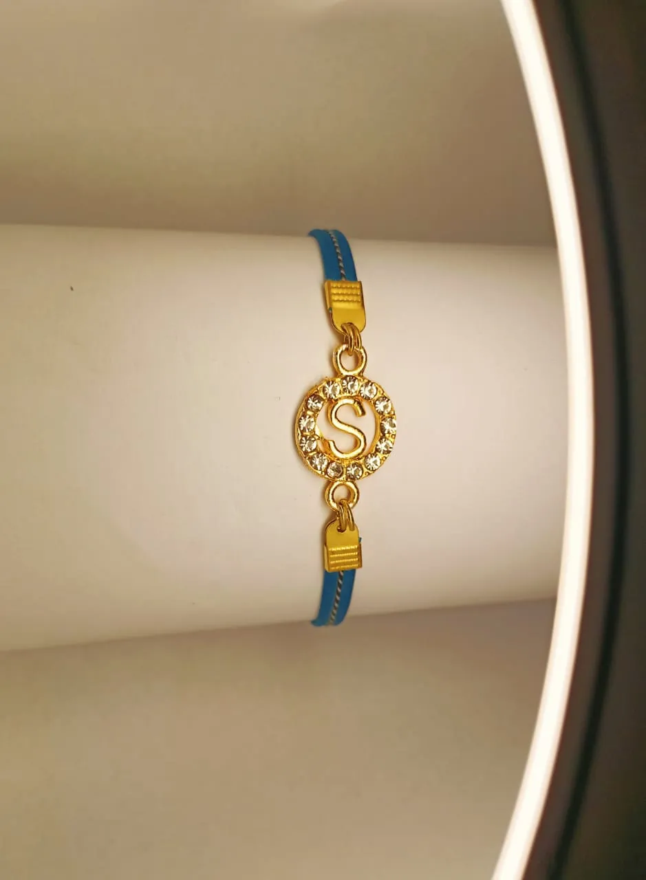 Classy Zircon Golden S Alphabet Sky Blue Leather Bracelet / Watch For Girls, Women